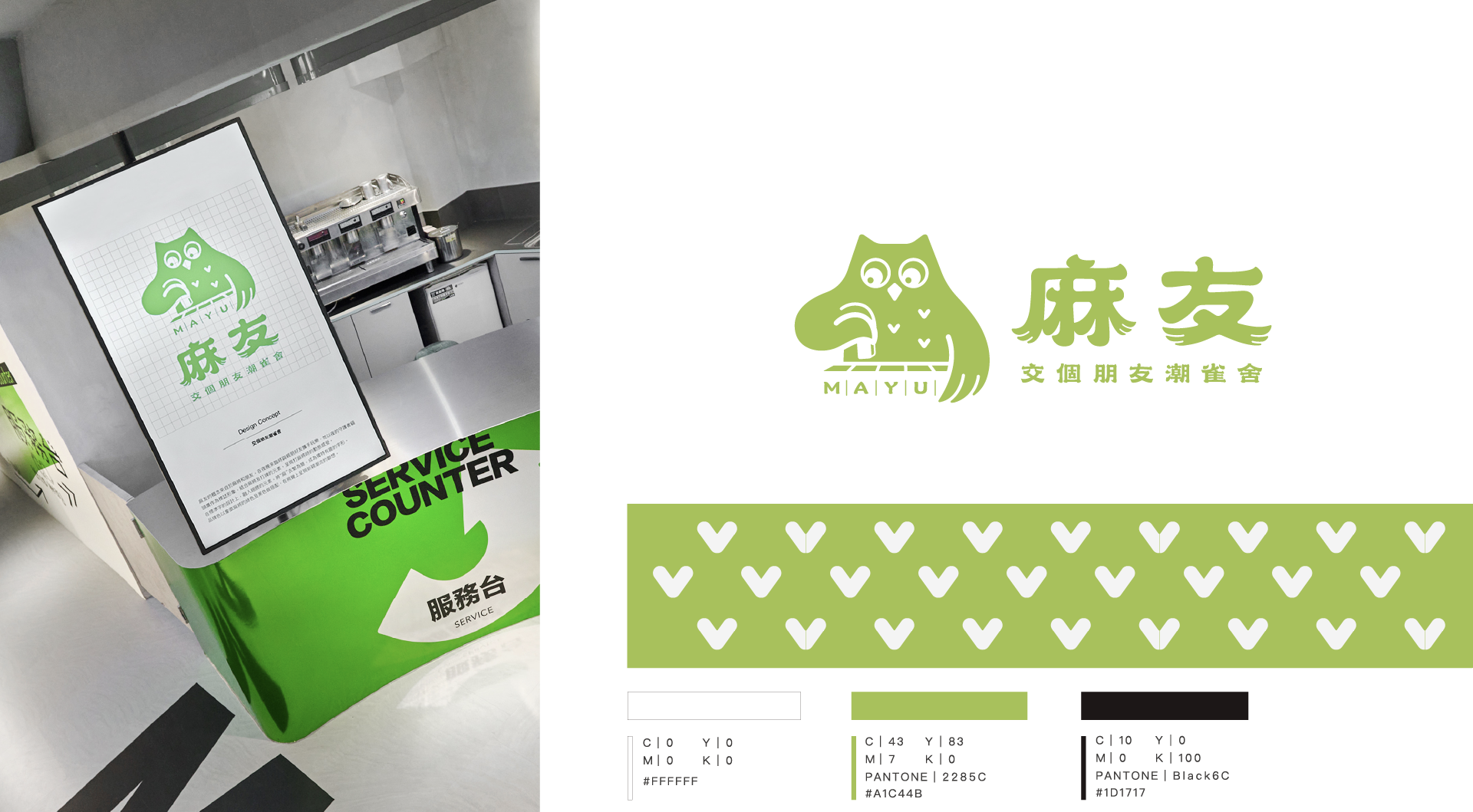 在標準字的設計上,融入翅膀的元素,將“麻”去繁為簡,成為獨特有趣的字形。品牌色以象徵麻將的綠色及黑色做搭配,在視覺上呈現新穎潮流的聯想。